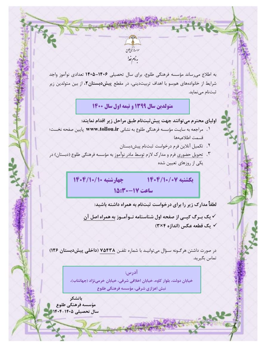 ولی گرامی ضمن عرض سلام و احترام؛ لطفاً پس از مطالعه دقیق اطلاعیه، جهت تکمیل فرم اولیه پیش ثبت نام، از طریق لینک زیر اقدام نمایید. تکمیل فرم پیش ثبت نام