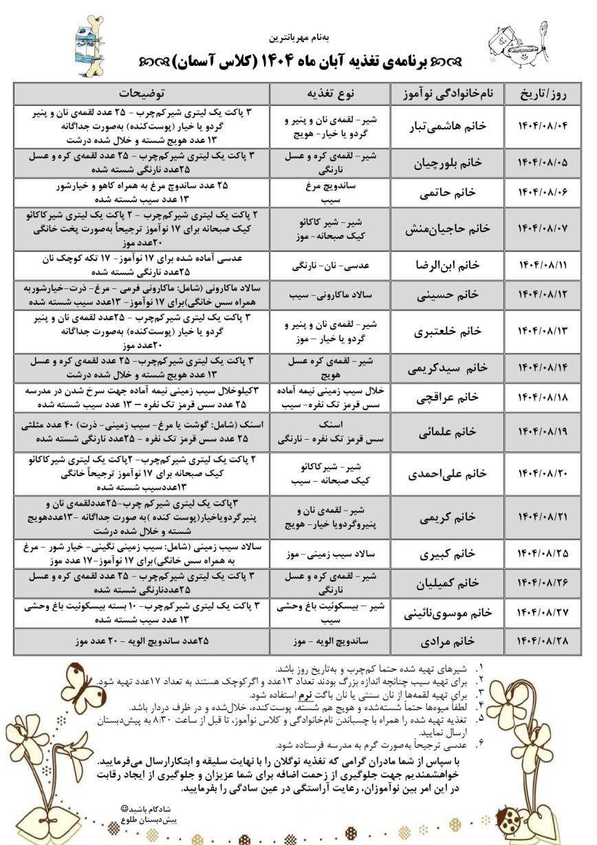 برنامه تغذیه آبان ماه 1404- کلاس آسمان