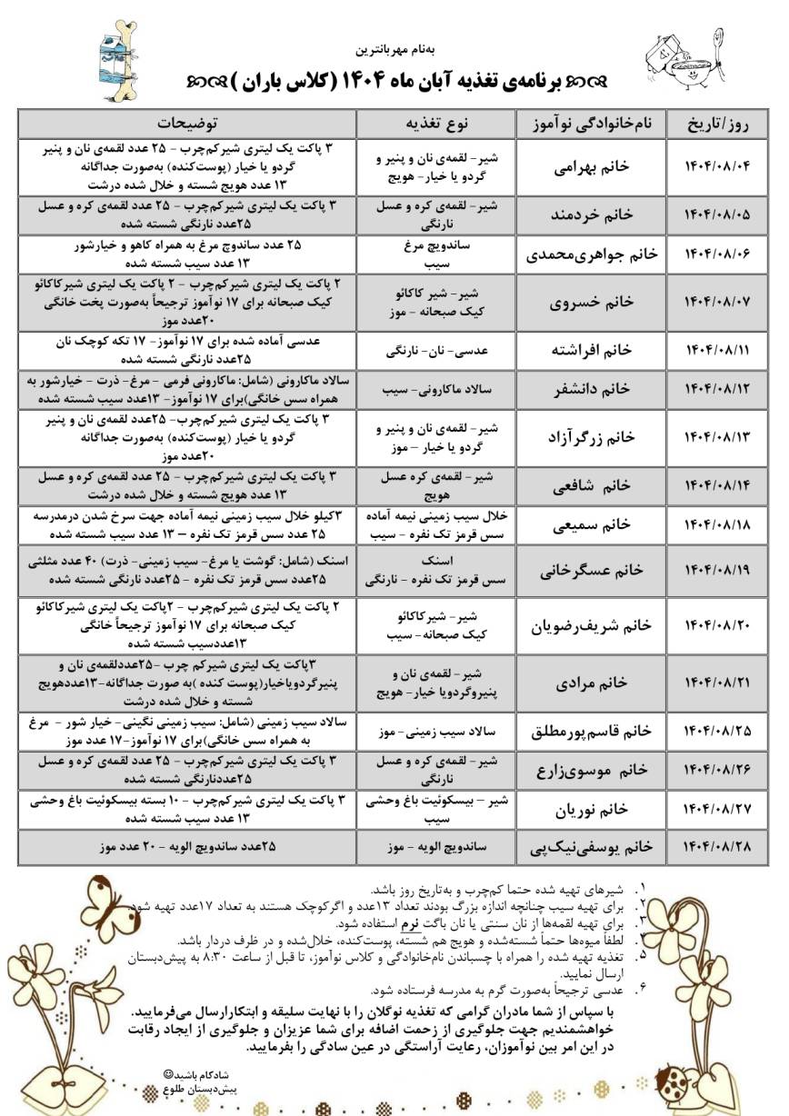 برنامه تغذیه آبان ماه 1404- کلاس باران
