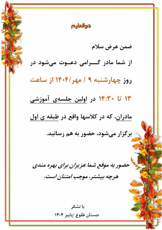 جلسه مادران پایه ی اول ابتدایی مهر ماه 1404