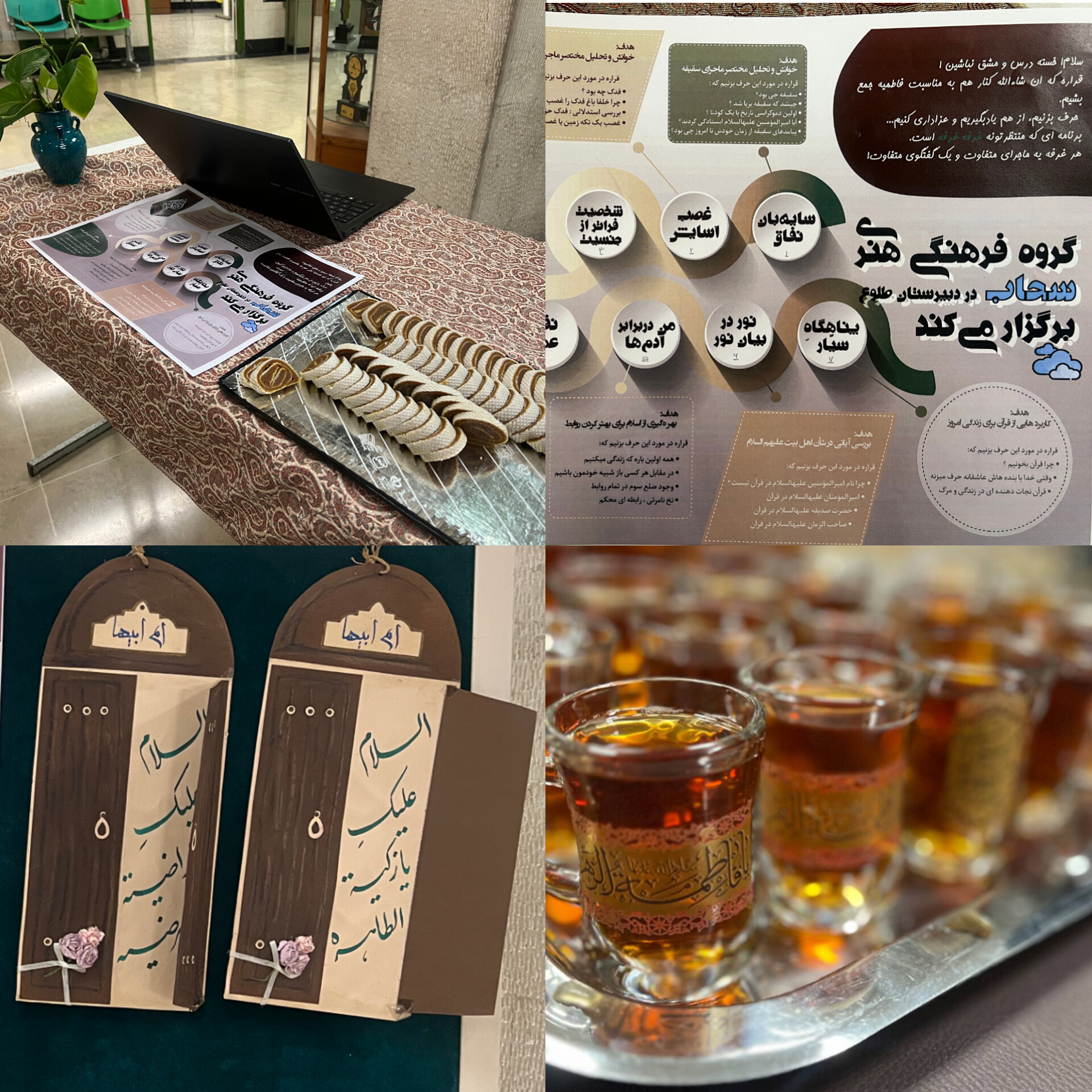 مراسم سوگواری ایام فاطمیه با همراهی گروه مذهبی فارغالتحصیلان مدرسه (گروه سحاب)، بهصورت گفتوگومحور و با طراحی مجزا برای دو مقطع برگزار شد تا متناسب با سطح سنی و نیازهای فکری دانشآموزان، فضایی عمیق و اثرگذار ایجاد شود. در این برنامه دانش آموزان متووسطه اول در گروه های کوچک درباره ی موضوعاتی که انتخاب کرده بودند با تسهیلگر گروه به گفتگو پرداختند و برخی از شبهات مربوط به زندگی و شهادت حضرت فاطمه (سلام الله علیها) پاسخ داده شد. در مقطع متوسطه دوم با دعوت از کارشناس دینی برنامه ای برای شناخت و ارتباط قلبی بیشتر با بانوی دو عالم طراحی گردید و در انتها همه ی دانش آموزان در برنامه روضه خوانی و سینه زنی شرکت کردند و با چای و شیرینی متبرک به نام حضرت صدیقه طاهره پذیرایی شدند.